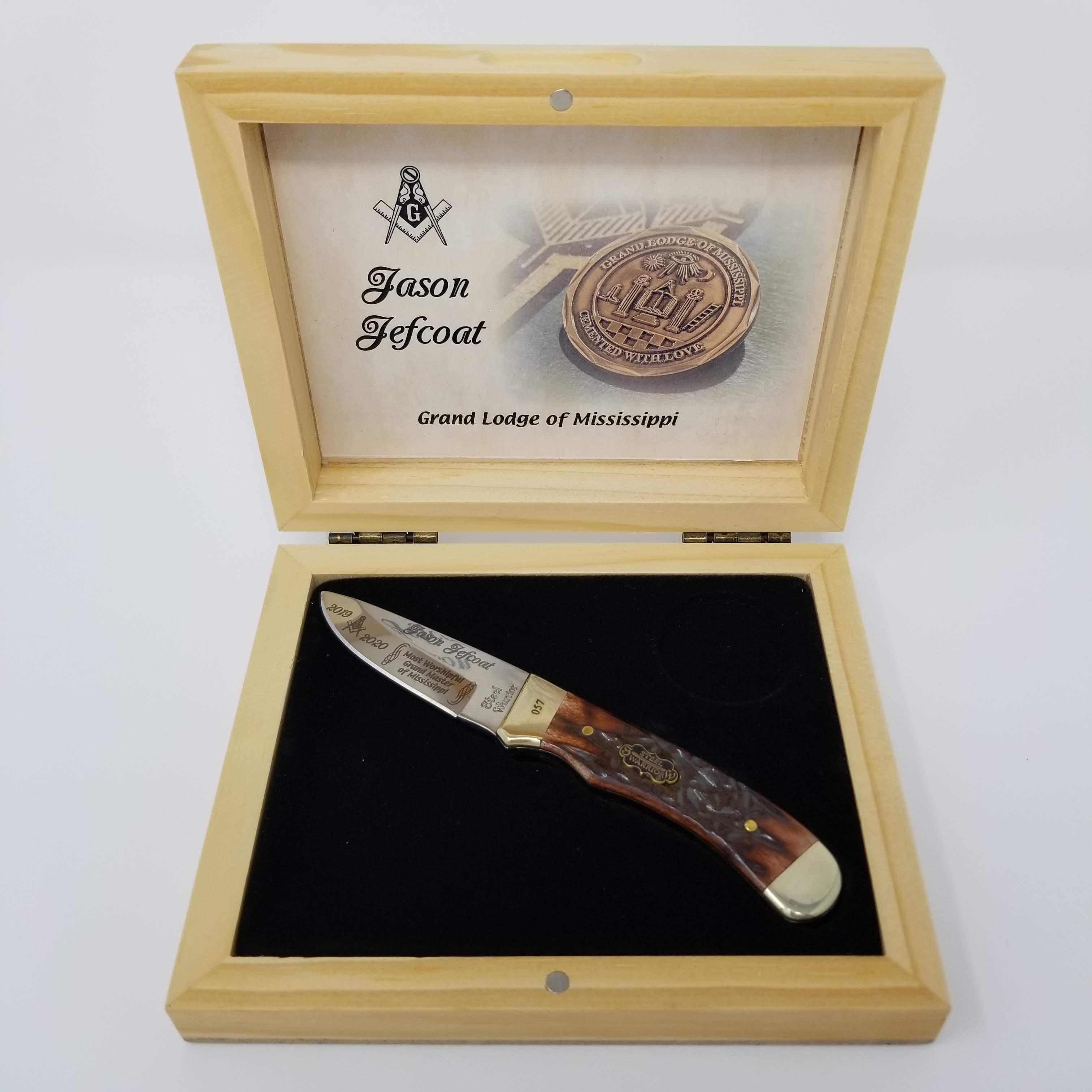 This Steel Warrior Knife is engraved to commemorate Jason Jefcoat’s year as Grand Master of the State of Mississippi. Each knife is individually serialized and comes in a beautifully engraved wooden box.
